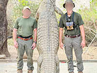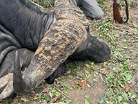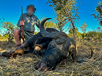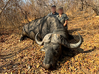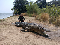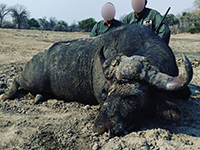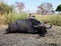 We had a fun hunt, all went smoothly. We looked at buffalo most days, successful on day 4. We followed a dagga boy in the morning and on the sticks - but no shot presented. Found another buffalo in the pm and eventually got a good breadside shot +/-70m. Perfect heart shot! We spent the next 2 days stalking crocodiles. Eventually on day 7 we found a big croc in an approachable spot around lunchtime. We snuck up to +/-10m, where BS again made a perfect brain shot. Excellent hunt SB - hope to see you back soon. |