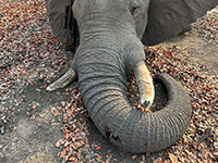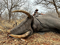 This was GG second hunt with us. This time in our Nyakasanga Area for a tuskless elephant. Such an awesome hunt we had. Looking for particular tuskless that was not pregnant and having a dependent calf is not an easy tasks, but a fun one at that, as we looked at multiple tuskless before we found the one we managed to get. She was by herself with a bull. We made an approach to 15 yards were GG made a great front brain shot. We look forward to the 2026 hunt! Cant wait!! |