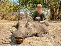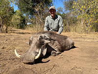 This is ES second time with us here at CMS. This time in Dande for a tuskless. Was accompanied by two amazing people GVDW and DVDW. We hunted hard for the first couple of days, seeing some amazing country and getting into elephant. It was tough for a few days due to the wind but we persevered and ES in one afternoon on day 5 bagged a warthog and a tuskless cos. Really awesome hunt with ES, GVDW and DVDW. |