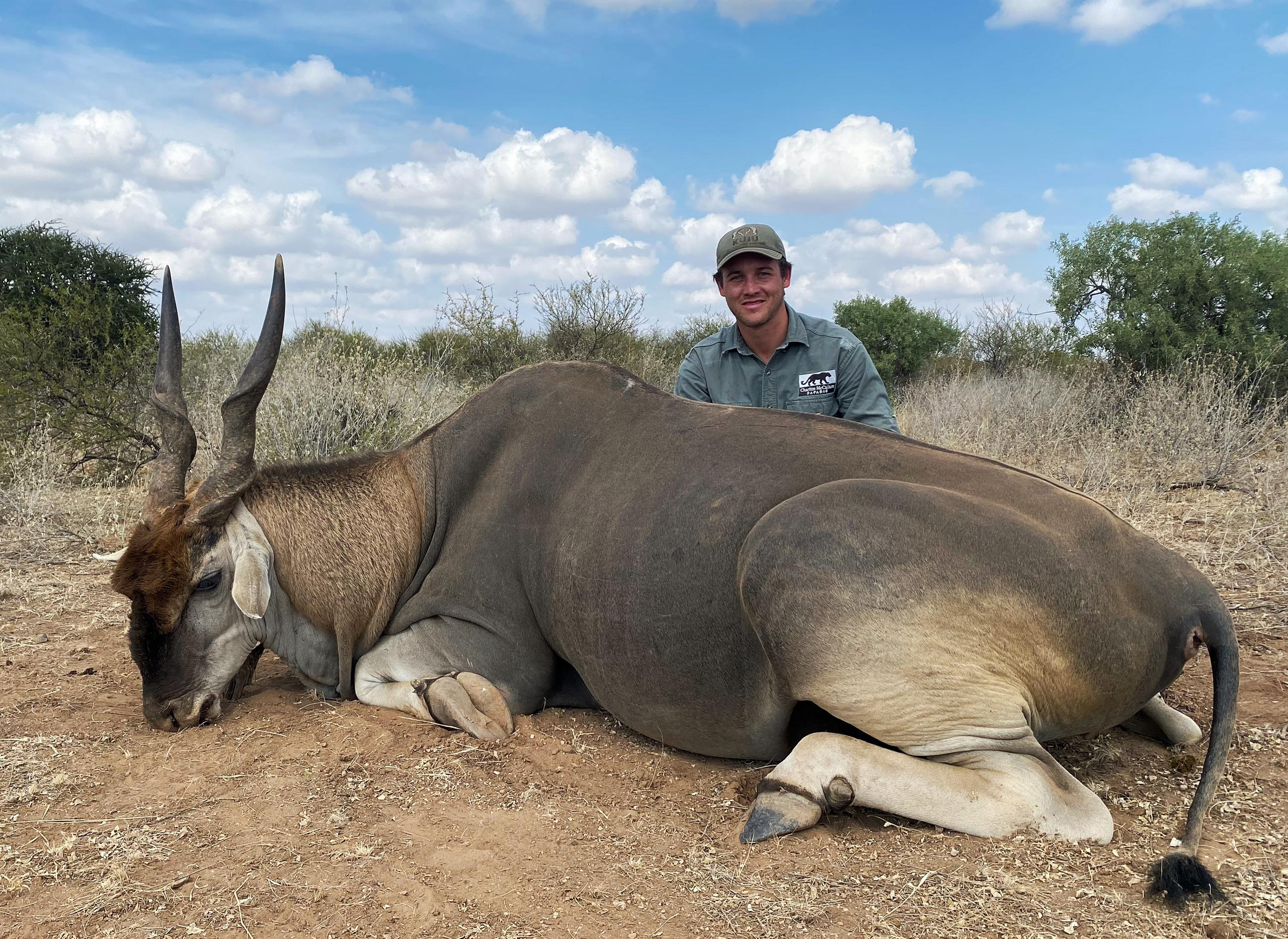 2 years ago ZA took photos of a buffalo that we planned to hunt on this trip. By pure good luck on day 3 unbeknown to us we found him in a group of 7 dagga boys. We got up to him +/- 40 yards where we gave a quartering on shot. Once down, we realized that he was the same bull we were hoping for. It was 13km from where we saw him before. Eland were few and far between, but on day 8 we got on alone bull track and found him in some mopane. Zach made a great shot behind the should with his 375 using TSX bullet at 120 yards. The bull didn’t react and we were unsure as to what had happened. Then the bull backed up a bit and fell over. Day 9 Zach got a very nice 57” kudu, and then day 10 was a relaxing fun day. |
