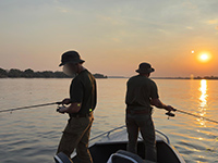 I was excited to return to the Nyakasanga for the second time in as many years. The Zambezi Valley has to be one of the best places on Earth, specifically the Nyakasanga area. Boating down the Zambezi River from the landing strip to camp is an incredible way to begin a safari. The camp staff and food were excellent. Conditions were unusually windy and not quite as hot as the same time period in 2023. Overall, hunting was fantastic: Buffalo on Day 3, Eland on Day 6 and Kudu on Day 8, all of which were very old, record book quality animals. A true testament to the trophy quality and game numbers in the Nyakasanga. Most impressive of all, once again, Alan and his team's skill and consistent success when targeting specific animals in such a vast wilderness. We had an up-close shot opportunity each and every time we tracked groups of dagga boys, 3 times in 3 days. Having everything filmed by Dan Macdonald with Safari Classics is something I will employ on every hunt moving forward and I would recommend to everyone. Richard and Peggy being able to make the trip made for an even better safari and will be a lasting memory. Thanks to Buzz for helping that plan come together. So many animals coming into camp each night was once again an added highlight: elephant, buffalo, waterbuck, and honey badger, with lion, hyena and wild dogs just outside of camp. The daily game drives, bird watching and especially seeing the wild dogs is always a special treat. Lots of lion, maybe too many, with 37 seen in one day. The Vundu fishing yielded many opportunities and great luck, with our group landing a 57 pounder and a true giant just under 100 lbs. I can't wait to make it back to hunt with Alan CMS. Thanks to all who made it such a memorable safari. |