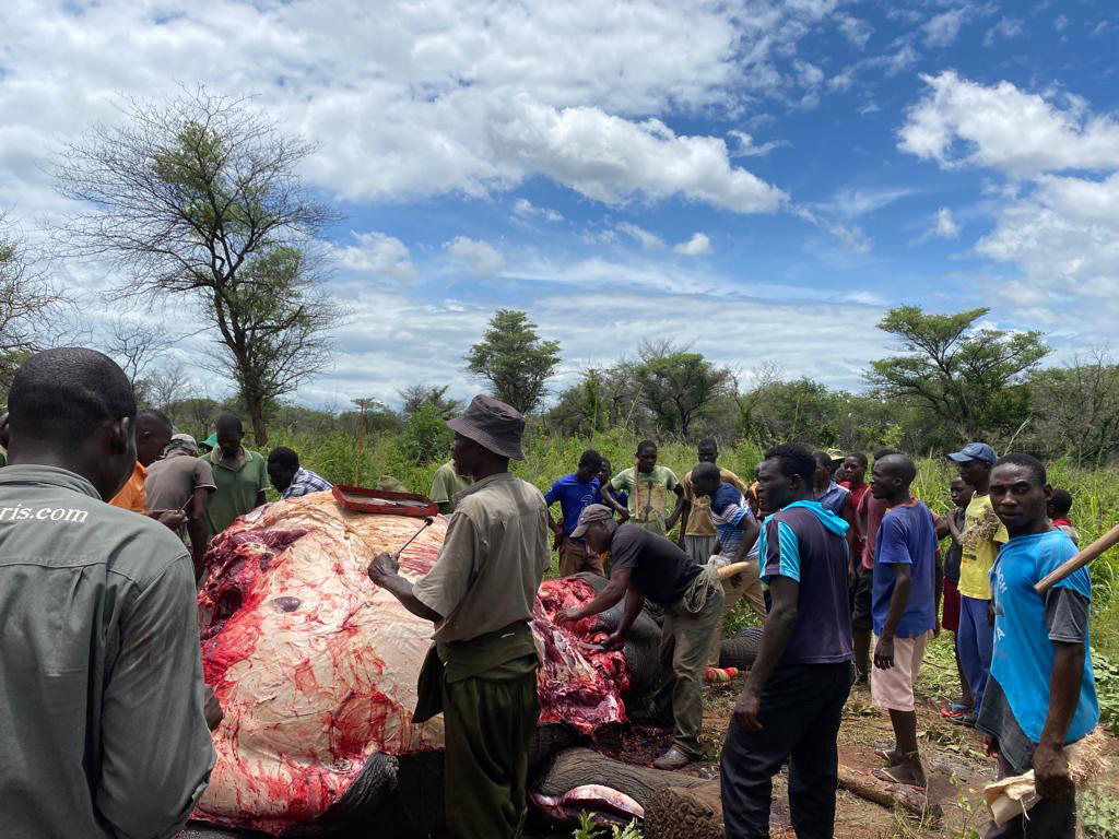 A true “proper” Zambezi Valley elephant hunt! The temperatures were high and the going was tough but we did well and had an extremely rewarding hunt! In total we tracked and found 18 bulls in 5 days which I was happy with. On the 5th morning we found 6 bulls on the Irira river near the villages. They moved out of the villages mid-morning, and we got onto them around noon, as they were resting in the shade close by. We finally got all six visual and chose the oldest looking bull with nice dark and attractive ivory. Of course, the was the bull who offered the most difficult shot. K took a frontal brain shot with his 450/400NE at about 35 yards – did not quite make it but did get close enough to the brain for the bull to stumble and allow for a relatively simple back up shot. K’s back up shots were good, and the bull only went 20 paces. It was so good to hunt the old fashioned way, with someone who appreciates that and with a double rifle |