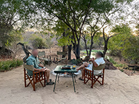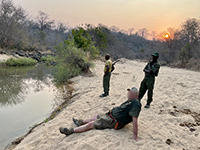 R got 2 impala rams and on day 1, so we managed to get 2 baits out before dark. Day 2 big male leopard found our baits on the Mwonzamtanda River at 3h55pm and fed throughout the night until 830am. We built a blind on day 3 and sat in the evening but he was educated, so we sat until 8pm and then left the blind. We walked in the morning of the 4th day and found him feeding. R made a great shot through his heart and he was dead within seconds. That afternoon we went for a walk along the Manyimo River above Mururu Camp, hoping to find bushbuck. We happened upon a fresh ele bull track with lots of wear. We tracked him for 30 minutes and came up to him. Turned out that he was exceptional, so made a final approach to 20 yards and R side brained him. What a great day. |