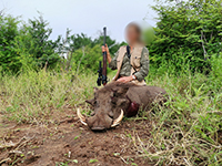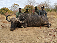 G wanted to experience buffalo hunting, so didn’t want to rush into shooting one. Day one we saw a 40” in open mopane at 50 yards and turned it down. We saw a few other good bulls around the 40’’ mark during the course of the hunt. We were on buff every day except day 2. On day 8 we found tracks of a herd (which were being followed by lions) early and by 0730am we caught them in fairly open ground. We chose a 38’’ bull and G took a quartering on shot at +/- 70 yards. He ran about 100 yards and went down and started bellowing. Two lionesses rushed up to and a group of bull ran in and chased the lions off before running off themselves. A great way to end our buff hunt. The next morning G shot a nice kudu bull. A great shot at about 300 yards. The last day was spent looking for warthog, and although we saw a few we never saw a good one. The weather was cloudy and cold and one day of rain on and off. |