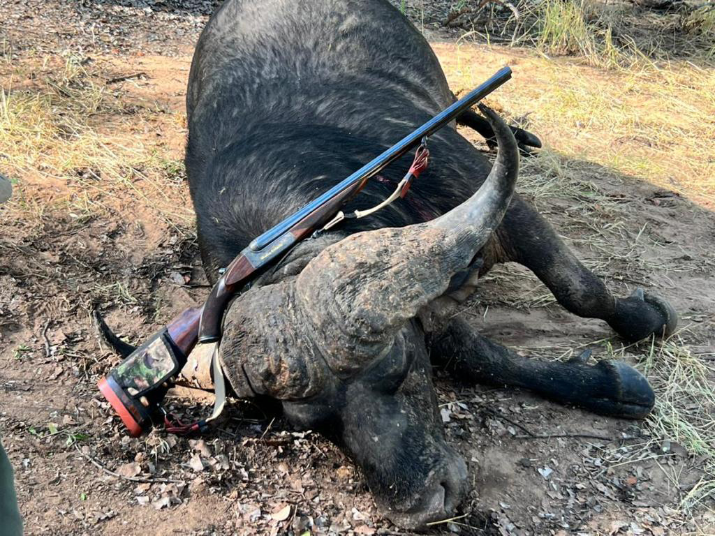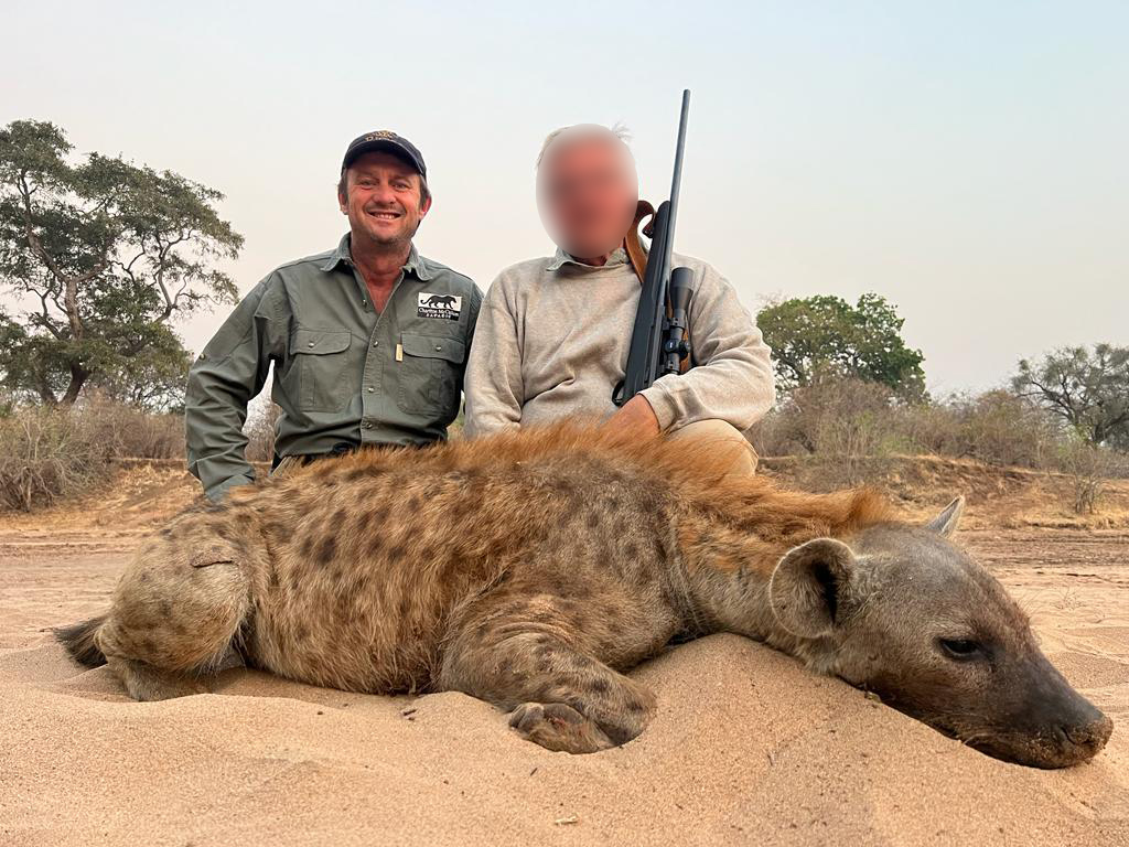 TW was wanting an old warm down dagga boy which is like looking for holly grail in Dande. We knew it was probably not possible, but we set out to look for it regardless. We followed a few different bulls/groups of bulls and had one amazing viewing of 9 bulls joining a herd late afternoon of the 2nd or 3rd day. We got beaten “hand down” by some bulls, that managed to elude us every time. Other bulls gave us fleeting glimpses, but nothing worn down. On day 4 TW secured an extra buffalo tag for his son AW, who was celebrating his birthday. AW was on sticks a few times with a great old lone bull, but eventually he left us in the “dust”. The following morning, we came across a herd close to camp. We got in front of the herd and a bull was feeding 60 yards from us, so we decided it was a first buff for AW to take. He made a great shot, it ran +/- 100 yards, and stood long enough for us to get closer and put a few extra shots in. The next day we decided to try a different area and found tracks of 4 bulls early. We tracked them for about 1 hour and found them lying down in a fairly open area. The only one we could see looked to be worn down on his right tip, so decided straight away to take him. We closed the distance to about 40 yards. TW made short work of him with his VC 500 NE. It turned out that not only was the bull worn down, but broken off on the left side. What a stunning buff – the “holy grail”. The same afternoon we set up a hyena bait and built a blind. We walked early morning the next day and TW shot his hyena. We then went to the river for the rest of the day. It was very hot at times, but we did get some rain, so, a few days were pleasant enough. A great time spent with TW and AW. |