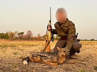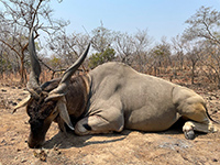 Tuskless - We got the tuskless on day 2 in the afternoon. We walked to a pan after lunch we got there, we heard a few different herds of ele so we started to look through them. It wasn’t long before we located a shootable tuskless. We got into position, but GW was still trying to make the perfect shot. When she moved off. It took us a while to find her again and eventually got back into 20 yards. She had heard us and was swinging from side to side. Unfortunately, when GW got his shot she swung and GWs shot missed her brain. He did manage to get a couple of shots in before she disappeared. We tracked her for about an hour before catching up. She was not too well and would have died if we hadn’t caught up. A few more shots eventually put her down. We had to back away as the other eles were not leaving, so had to go back in the morning for photos. Eland – we were lucky enough to spot a big herd of eland running off with a great old bull. We tracked them, bumped them once, and then caught up again, unseen. We got within 100 yards and GW made an excellent shot through his heart. Plainsgame - We got GW a hyena and a good bushbuck, but failed on the elusive warthog! |