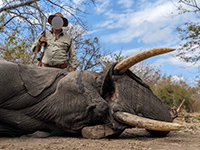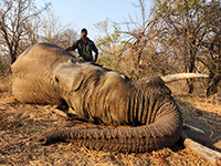 Seeing as this was GP first elephant hunt I had all intentions of taking a few days to get close to elephant and get GP comfortable around them and give him some coaching on shot placement. Well this didn’t happen!! Day one we picked up a couple of bull tracks and after following them fora short while the crossed the Amadundumella river, we decided not to get our feet wet, so we meet up with the truck and drove round to the other side where we picked up a few more big tracks. We followed them for about an hour when we heard them, but now they had joined with more bulls and were resting separately in groups roughly 100m apart. We tried to get the wind right but we got smelled and to make things worse we flushed a kudu bull and he ran towards the eles. Sending them all on their way. We decided to have some lunch and then continue following. At this point many other bulls had joined them, mostly young bulls which we eventually started bumping into. The big bulls seemed to be ahead of the rest (one bull had a huge track and distinct crack) so stayed on all the big tracks until the wind was good and managed to get beyond most of the younger bulls. The bush was particularly thick. We finally caught the big bull, I could see 4 of them. They were all a little big to be NTs and the wind/thick bush made for a tricky situation, so I decided we should head back out and leave them alone. As we were doing so an unseen bull to our right smelled us and ran off. The other visible bulls turned toward us and started in our direction. I shouted and they turned and then heard Nyathi shout watch out. I looked up and suddenly a large bull was in full charge and almost on top of us. GP and I almost fired simultaneously (at this point the bulls head was down and 4 yards from where we stood). Missing the brain, but knocking down, I stumbled backwards to avoid being fallen on and tripped over a bush, but managed to get a second shot. GP had rapidly put 3 shots in, but the bull still managed to get up and tried to run off, but GP managed to reload and side brain him before he did. One more for a ‘coupe de gras’ and it was over. We were all shaken, but happy to be alive. When we had had a breather and had time to absorb what had just happened it was such fun watching everyone animatedly relay what happened and how everyone had reacted during the situation. There was much relieved laughter. I was impressed with GP’s ability to focus on all the details and totally respect that he remained solidly at my side and dealt with one of the most formable charges I have had to face. MP had the presence of mind to get off the path that we were on and get behind a small tree, which in hindsight would have been a saving grace as the bull would have carried on down the path after everyone else. Day two was recovery as it was late in the pm that we took the ele. GP and MP are such a wonderful couple, we had so much fun and laughed a lot. The camp staff, our team and I thoroughly enjoyed having them with us. |