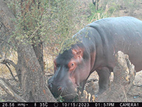 The buffalo was shot on day 3 in the villages up near Chapoto. We experienced a charge while following up. The hippo was shot on day 4 between DDF and police camp. It was recovered and produced 11 leopard baits. The warthog was shot on day 13 and hung for bait. One sable bull was seen in a herd on day 4. This bull later (we suspect) left the herd as the herd was seen later in the trip with no bull, in the same place, and the bull was spotted alone. A herd was also tracked from Ante pan, and the new solar pump near Chapoto. No shot opportunity was presented. Several kudu bulls and a herd of zebra was spotted twice. 2 male leopards and over 10 females (some sub adults) hit bates. Both males were mating at the time of hitting the baits, resulting in some delays. We shot our tom on the last evening in natural light. A nice mature big tom. |